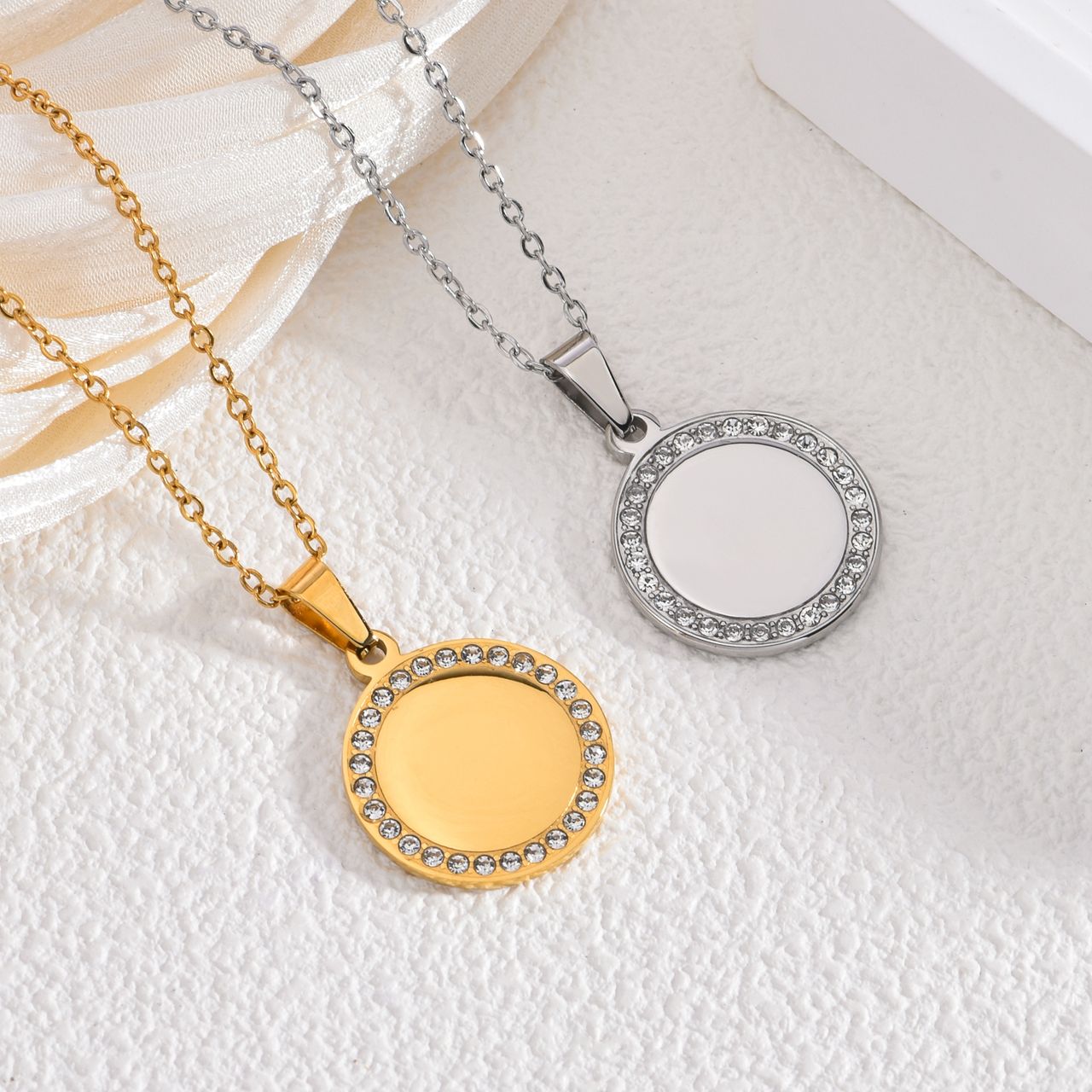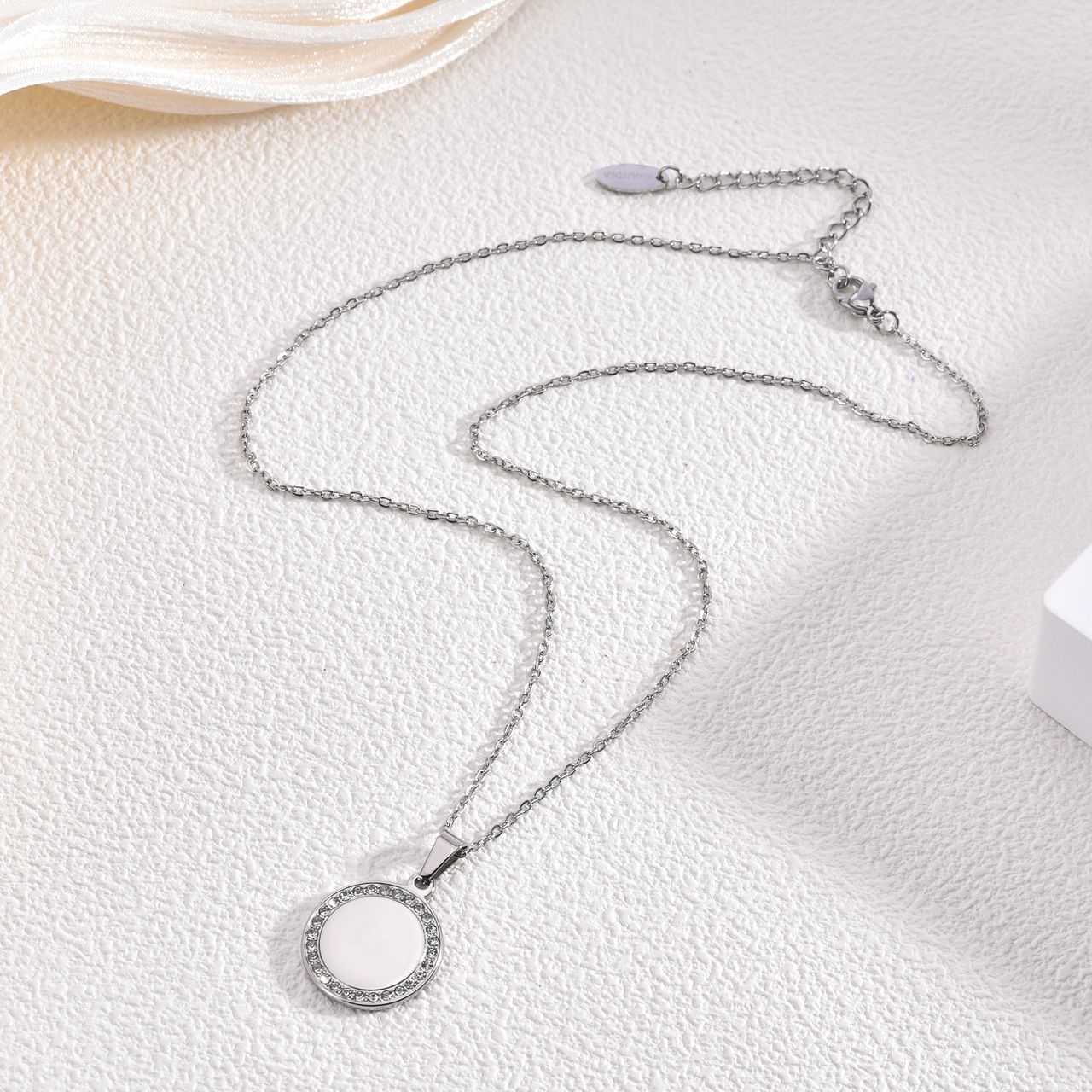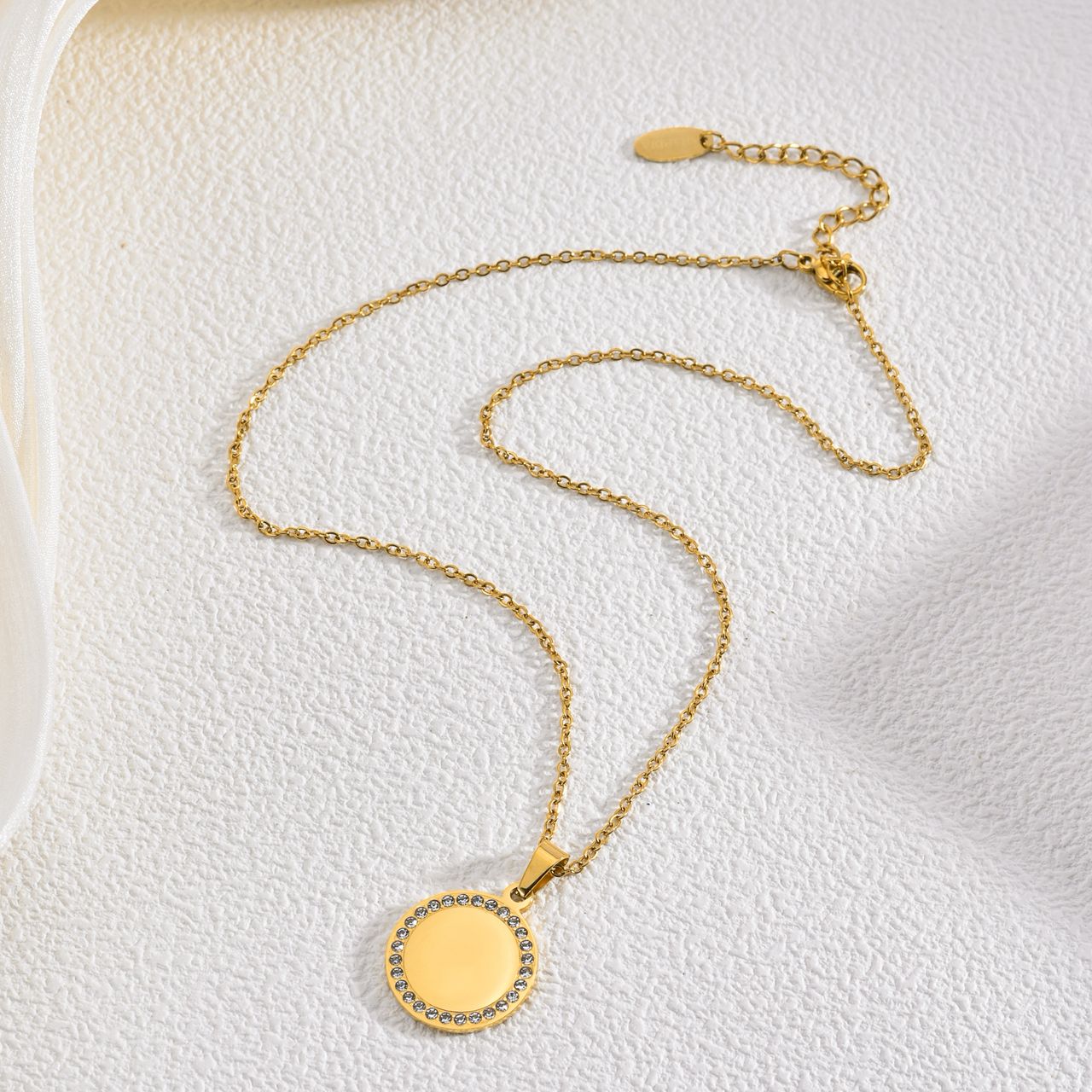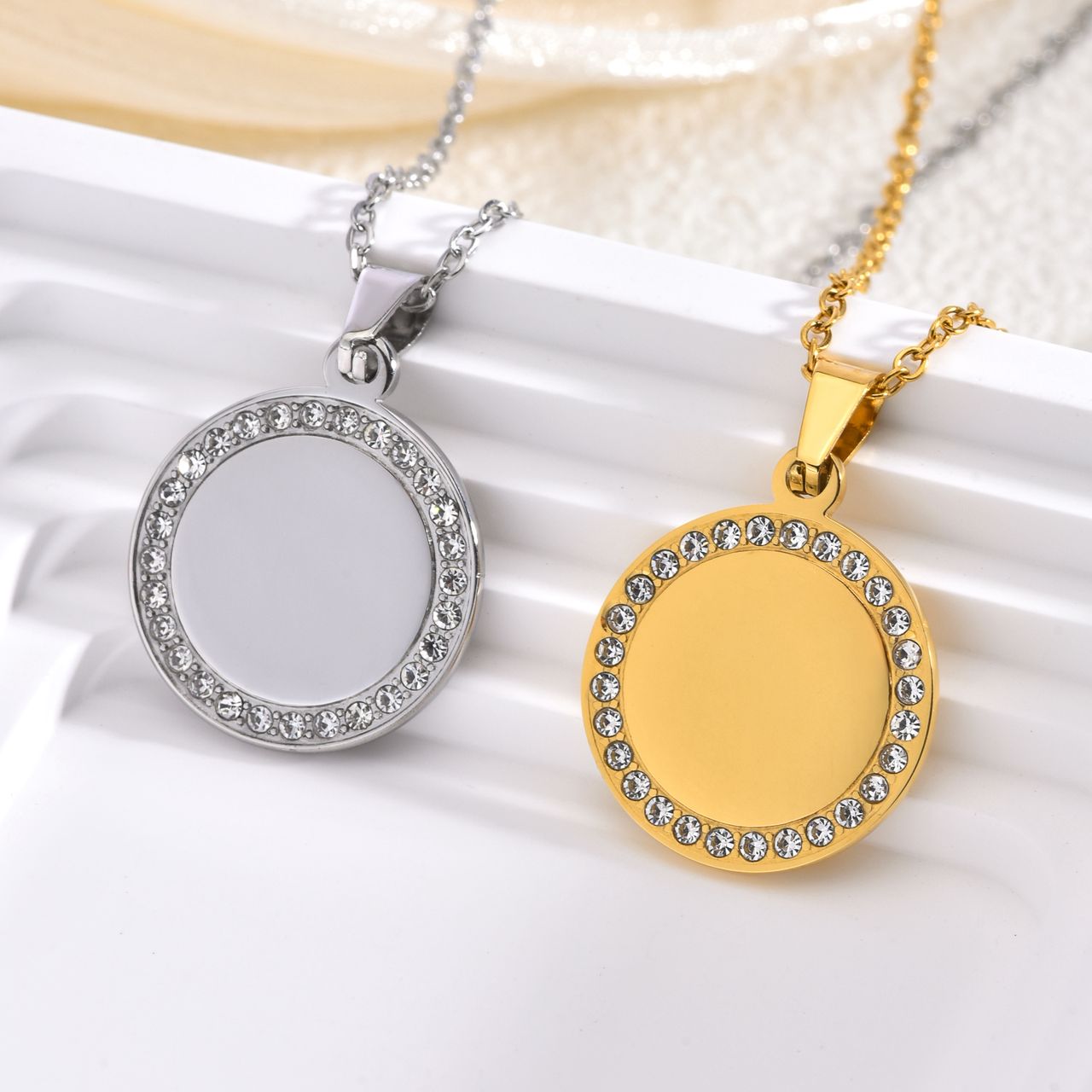 Deine feine Kette mit einem Namensplättchen umgeben mit Zirkonia steinchen. Die Plättchen werden maschinell auf bis zu drei Zeilen graviert und im Anschluss fertigpoliert, ganz individuell, wie du es möchtest.